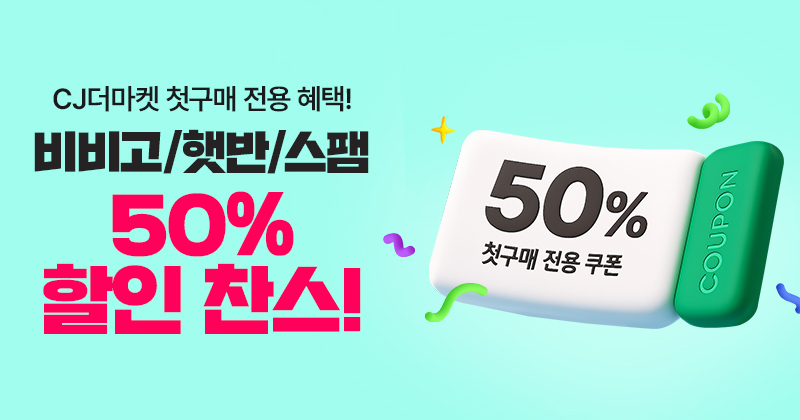 CJ더마켓 첫구매 50% 혜택! 햇반/비비고/스팸 반값 특가