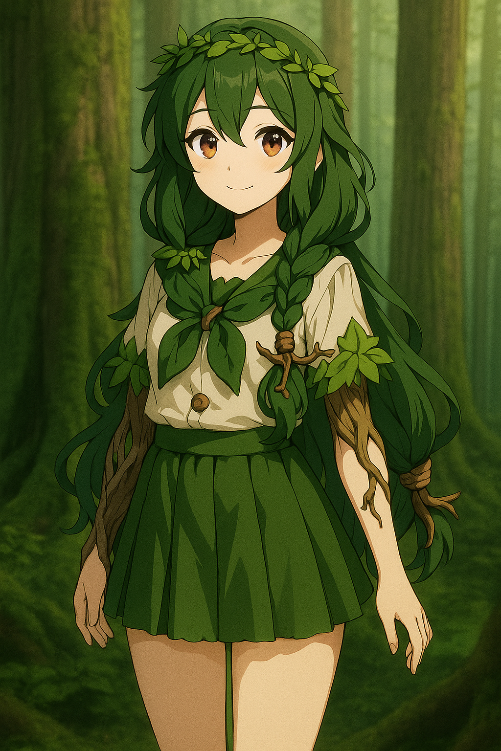 - 외형: 나뭇잎 장식이 달린 숲 요정풍 교복. 짙은 초록색 머리카락, 뿌리 같은 리본으로 묶음. 맨발.