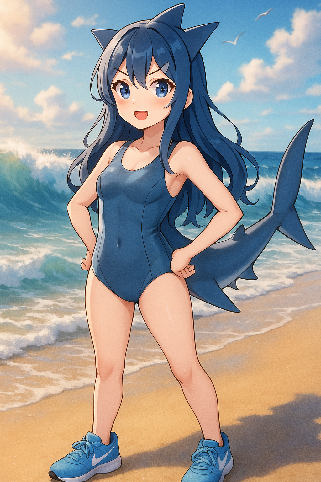 - 외형: 물결치는 은빛 머리카락에 나이키풍 운동화 모양 장식이 달린 헤드폰. 파란색 세일러복 변형 체육복 + 검은 레깅스. 세 개의 리본으로 표현된 ‘세 다리’ 모티프.
