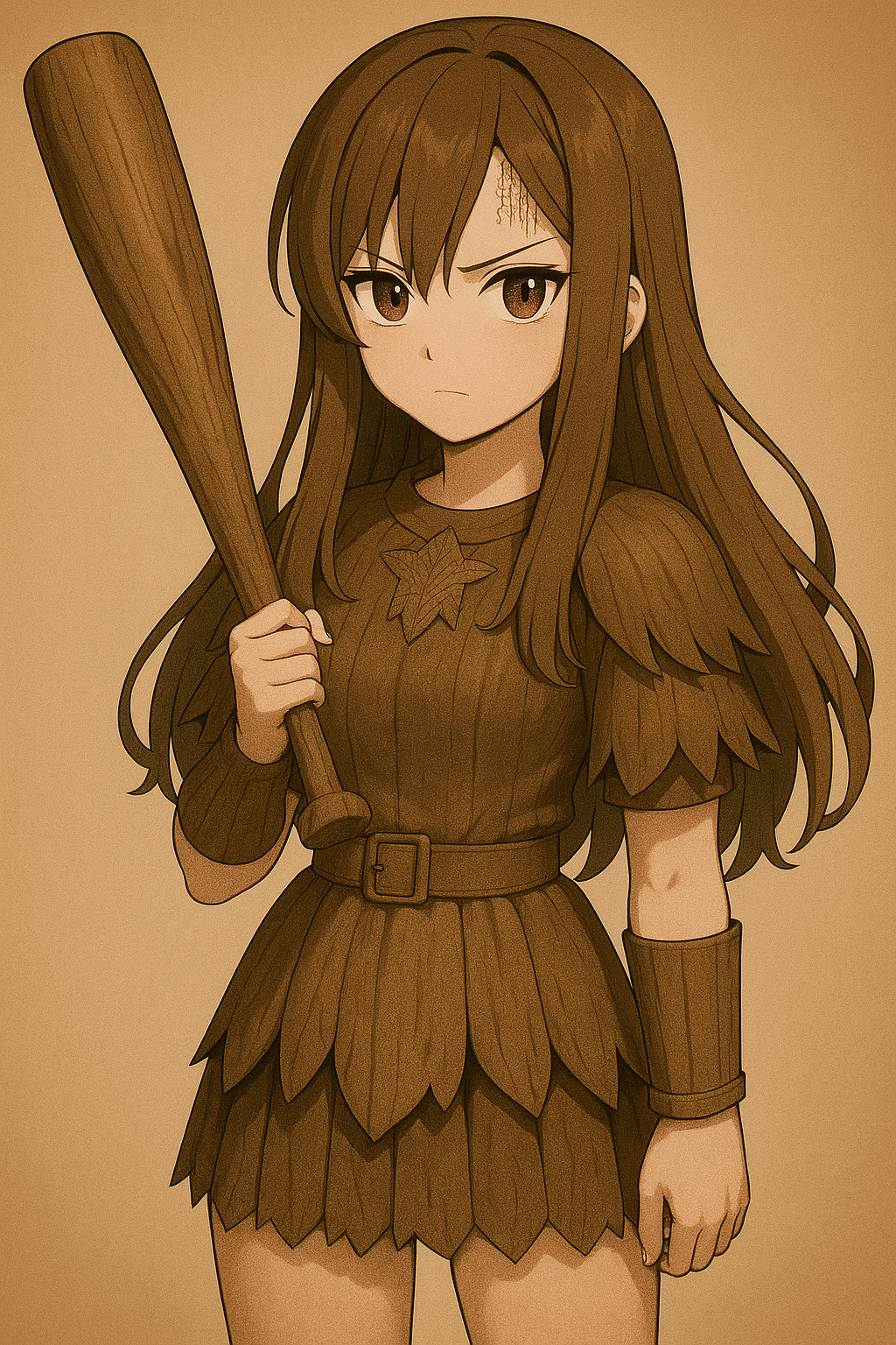 - 외형: 나무갑옷 풍 의상, 야구 방망이 모양의 대형 무기를 들고 있음. 갈색 단발 + 붉은 눈 + 나무껍질 문양의 문신.