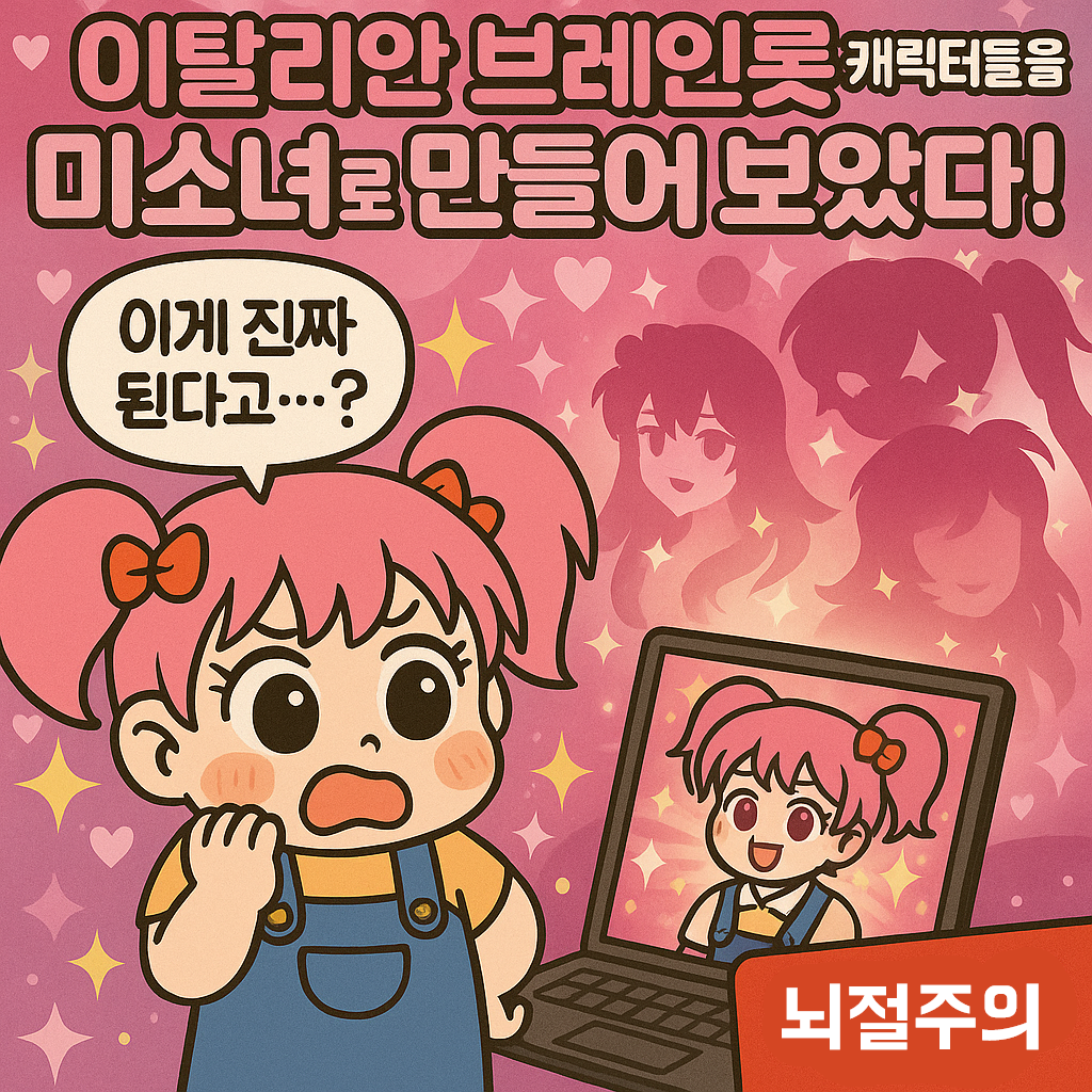 앵하! 말광량이 앵치에요~ 지금 내가 있는 곳은 바로~머릿속에 이탈리아의 햇살과 이상한 단어가 뒤섞인…정신없는 브레인롯 세상이야! ✨오늘은 그 유명한(?)"카푸치노 아사시노","봄봄비니 구지니","침판지니 바나니니"까지!이 세 명의 미소녀(!)들이🍝 말도 안 되게 귀엽고🍕 어딘가 정신 놓은 매력으로당신의 뇌를 녹여줄 거라고~!? 헤헤, 책임은 못 져! 💥지금부터 브레인롯 판타지 미소녀화 프로젝트,시작해볼까? 🎶 이전글도 봐줘!!2025.05.27 - [🌀 이탈리안 브레인롯] - 🎀ChatGPT로 이탈리안 브레인롯 캐릭터들을 미소녀로 만들어 보았다! (뇌절주의) 🎀ChatGPT로 이탈리안 브레인롯 캐릭터들을 미소녀로 만들어 보았다! (뇌절주의)안뇽! 앵치닷!!오늘은 진짜진짜 진짜진짜 강력한 컨..