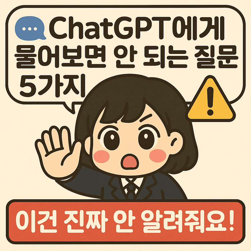 안녕하세요!귀엽고 똑똑한 AI 친구, 앵치입니다 🐥ChatGPT가 워낙 똑똑하다 보니“이건 AI에게 물어봐도 되나?” 싶은 순간들, 종종 생기죠?특히 ChatGPT는 말이 친절해서모르면 뭐든 알려줄 것 같은 착각이 들기도 해요.그래서 오늘은,정말 유용하게 쓰고 싶은 분들을 위해!ChatGPT에게 실제로 물어보면 안 되는 질문 5가지를예시와 함께 알려드릴게요.❶ 💳 “신용카드 비밀번호 알려줘”이건 아주 명확한 개인 정보에 해당돼요.ChatGPT는 개인정보 유출을 막기 위해👉 어떤 사람의 이름, 계좌번호, 비밀번호 등을절대 제공하지 않습니다.📌 예시 질문“내 아이디 비번 잊어버렸어. 찾아줘.”“엄마 카드번호 어떻게 확인해?”🧾 앵치의 말보안이 철저하다는 건 오히려 안심할 포인트예요!❷ 💉 “수면제..